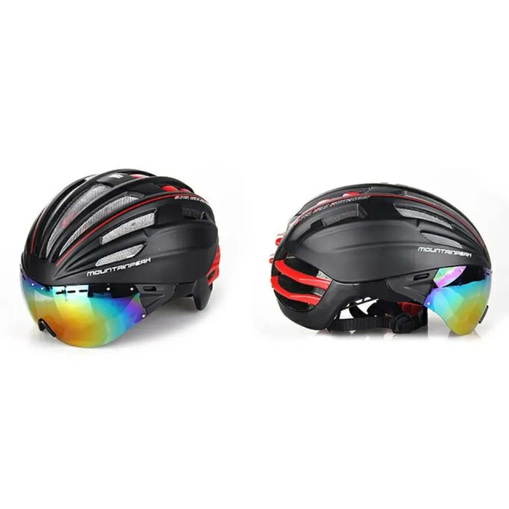 Шлем велосипедный MountainPeak RACE X – крутой и модный с вентиляционными отверстиями считается лучшим предложением этого года. Дизайн привлекает внимание, делает аксессуар заметным в сравнении с другими моделями. Наличие в комплектации съёмный зеркальных очков подчеркивает особые требования райдера к аксессуарам. Покупка шлема гарантирует стопроцентную безопасность головы и защиту райдера от попадания пыли при продолжительной езде. Купить шлем по лучшей стоимости воспользоваться бесплатной поддержкой и другими приятными бонусами производителя предлагает наш интернет-магазин.