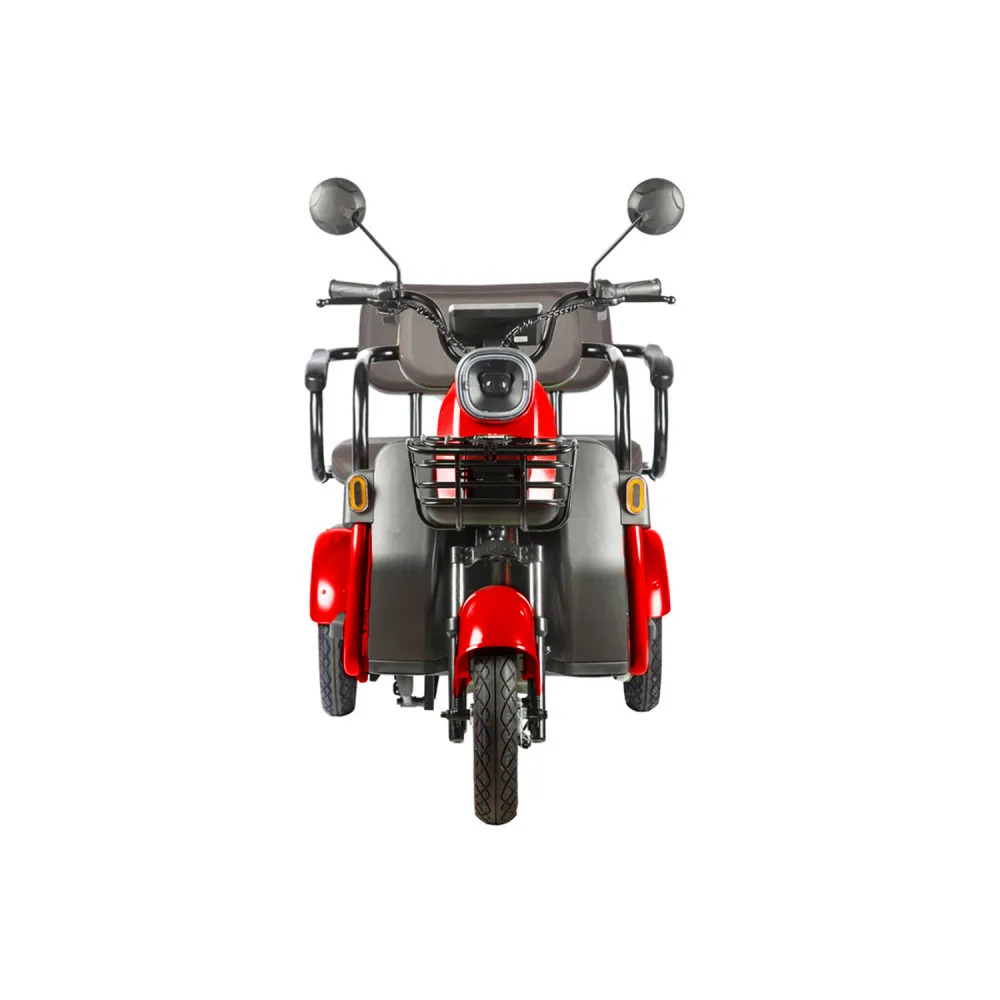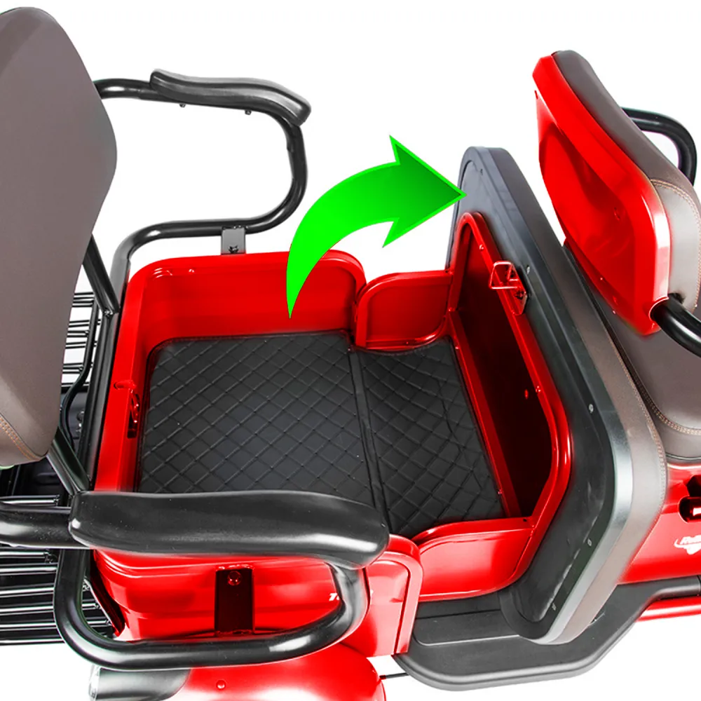 Электротрицикл Rutrike Топик красный – лучший вариант для активного отдыха с друзьями, туристического бизнеса, развлечений в частном секторе. Вместительная модель позволяет насладиться природой, свежим дуновением ветром, притоком дополнительной энергии. Для заказа техники по приемлемой цене выгодно предлагаем связаться с менеджером нашего магазина по телефону или в чате. Мощность электромотора составляет 800 Вт. Батарея в комплектации отсутствует. Производитель предупреждает, что для данной модели трицикла необходимая емкость аккумуляторной батареи составляет 48 В и 60 В. Купить АКБ можно самостоятельно и через наш интернет-магазин. Последний вариант считается более выгодным. Техника оснащена комфортабельными сиденьями. Под последним имеется грузовой отсек. Водительское сиденье из эко-кожи с подлокотниками и спинкой, анатомическое, удобное, не вызывает дискомфорта. Для исключения отека ног модель оснащена мягкой прорезиненной платформой. Управление трициклом простое. Не требует специального обучения. Функционал размещен на рулевой части. Колесная часть 3.00-R10 – накатистая и устойчивая одновременно. Оснащенность гидравлической пружинной подвеской делает движения мягкими по неровностям. Для заказа трицикла быстро, предлагаем сделать телефонный звонок менеджеру или написать ему сообщение в чате.
